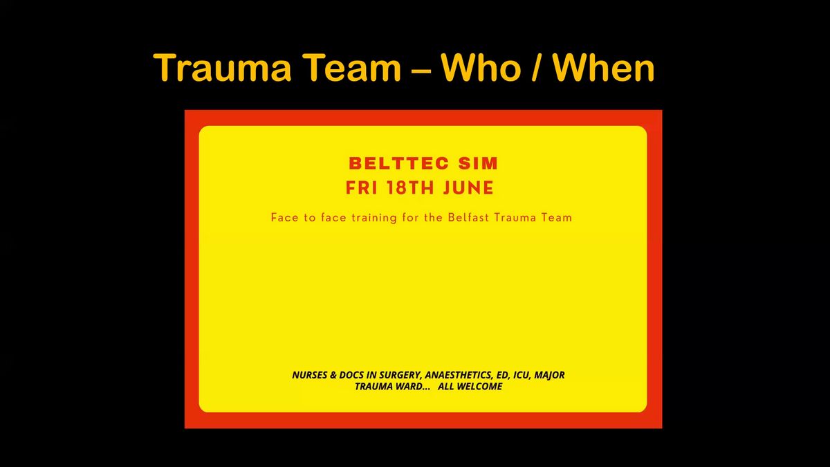 so in this that you were going to look at who comes when the drama team has activated and when is it actually activated on high? The handover works, so you'll know that there are some comparisons being made within emergency teams. And between that and a Formula One scenario and whether those comparisons air fare or not, and there are some parallels, the Red Bull at team did a pet stop, which was a word to record breaking one in 2019 with the recording time of 1.2 seconds and the Brazilian grown pre on board, I suppose, How do they get to that point? So they have a well organized team. I've always got a lot of money, which we don't always have a healthcare have a clear a leader. And that's the person wearing the red helmet. And they also have force of teams operating there and one around hte each tire for a tire change on a refueling team. Age personal. The teen news exactly what they're meant to do it and have a rule in that, and they have a shared your purpose, and that's really to refuel. 100. Please tires quickly as possible on they practiced together, relentless late to try and improve those times. So what's our shared purpose in a trauma team? Let's just ask the patient's airway breathing, circulation, urologically and explosive to look for life threatening injuries and so that we've Marge those before the patient goes for traumatic trauma. CT and I want to get through the drama CT in less than 30 minutes. So those really are shared ghouls at trauma colds or activated based on the patient's shock index or on the anatomical location or the nature off their injuries. They can be activated when the patient arrived in hospital or pre hospital. A beast on the information that's given by the Northern Ambulance Service or by the Helicopter Emergency Service drama calls are color coded, so they're either red, which is the most emergency on on stable patients Number or green, red and amber colds. Both require a major trauma team response, with green dramas being managed mainly in heist by the CT team, with consultation potentially back surgeons and other other teams as well. So a red calls activated when you have a critically unstable patient and on, you can determine that really based on the information given, um can be helpful to think about the prehospital, or hospital based shock index. Chuck Index is hardly it's and over systolic BP on. Really, If your heart rate is approaching and your systolic BP prehospital e, and then you're likely to have ah shock index approaching 0.9 or in hospital if the heart rate has just over taken the systolic BP or the lactate measured in hospital is over 3.5, and then you're dealing with a reg trauma on that requires a consultant, and hence later. So you got a Troma rotor within the merchant department of consultants who will then come in be present to leave the team on, then a representation from orthopedics, general surgery on anesthetics and often needy doctor involved in the team as well. Out, register or level. The under trump calls are little more varied and sometimes harder to determine those patients with a GCS of less than 12 and the motor score being most important there, those with the system and BP less than 90 day or sustained and changing respiratory rate under 10/29 was with traumatic amputations. Any penetrating trauma, centrales chest or abdomen? UH, open or depressed skull fractures, suspected pelvic practice fractures, spinal injuries with abnormal neurology, patients with term long bone fractures or those with burns. Over 20% estimate facial or circumstantial burns because those burns patients will usually need anesthetic involvement and airy management or surgical management, respectively. So when you look at the trauma team and the CD the sauce over here, this is what it should look like. Patient in the middle and with a certain number of set and objects there, so the emergency be so strolling is usually the patients right. A man at moment, hours in ventilator would be to the patient's left and at the back of the trauma big. There's a clock on which is set time. Zero in the patient arrives, and that lies everyone of the team to see how far we're progressing, you know what's the red line behind the red line will stand the trauma team leader on the scrape on there, maybe representation from radiology T X rays, for example. But often we're going up to see t t t get imaging. Um, the first part of coal, the anesthetic team, usually the head of the bed. And that's comprised off on a doctor on down on Aesthetic Nurse on then to the right off the patient, usually the breathing doctor and the breathing nurses, the breathing team on then the C team to the patient's left and usually one of the surgical at members of the team and then again on Emergency department nurse. So by staying to that fixed format and everyone knows who's on what team on but where they're meant to just stand, visit principles within the trauma team is to make sure that we manage the patient quickly and safely. To do that, we have to make sure communication is consents, concise, on structured, particularly around the time of hand over from the pre hospital service. So when they arrive with the patient before formalized that in a structure news at most and that's used in the trauma networks around the UK, this template will be up on the trauma white board and help your memory if you're not familiar with it. So it starts with the age of the patient, basic demographics, the time off, the injury and the mechanism off the injury on that may or may not be fully known. But other factors associated with an upper so come such a centrum mint or rejection from vehicle injuries that are seen or suspected, and the patient's basic vital signs on a degree of information about whether those are worsening or improving. And then the treatments given so prehospital e Those treatments would be, uh, pelvic binder, a spinal immobilization on deaf Phoenix. Access is being secured tranexamic acid