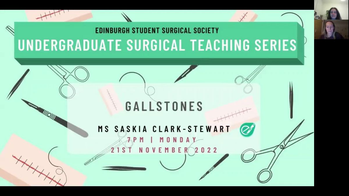 that's us. Live now. Good evening, everyone. Thank you very much for coming along to this evening's webinar. Lucas and I have been running a series and we're running it on behalf of Edinburgh Students Surgical Society. And this is an undergraduate surgical teaching series aiming to teach students, particularly the University of Edinburgh, but also more widely, um, elements of the undergraduate curriculum catered towards surgery. And this evening we're very grateful to have Saskia along to teach us about gallstones. Um, Saskia is a surgical trainee who is currently undertaking a year as a medical education fellow with NHS Lothian ahead of her application to hire surgical training. Um, she enjoys sharing her passions for surgery through undergraduate teaching and is a regular tutor at our surgical skills club as well. And she's looking forward to discussing gallstone disease with us this evening. So, without further a do, I will hand over to Saskia. That's great. Thank you, Beatrice and Lucas for organizing. And I appreciate this is a re, um, scheduled events. Unfortunately, I had some serious tech problems last time, so thanks all for joining again. So, gallstones. This is a topic I really enjoy discussing and certainly as a student, I don't think I had very much understanding of what they were and what problems can cause. I'm just going to turn my camera off to help with my signal. Um, and hopefully you can still hear me. If there's any problems, just pop questions in the chat, Um, and look as if you're able to move the slide on. That's great, so aims of session. So what we have is kind of short contents of what we're going to achieve tonight. So my other hat is as an anatomy teacher and demonstrator, which is where I might have met some of you guys. I was then asked me research fellow for Edinburgh uni a couple of years ago, so you can't understand gallstones and the problems they can cause without understanding the Billary Anatomy and again, To me as a student, this was a bit of a unknown territory. I could never really get my head around, build build ups and hepatic duct, so I'll hopefully clear that up for you tonight. We'll understand what the gallbladder does because we like to chop them out when there's gallstones there and they cause problems. But it's important to know what does the gallbladder actually do And can you live without it? We're going to also have a think about how gallstone disease might present, and it can present in a number of ways. And I've got a number of cases to show you tonight, um, that you will either have seen in practice or you will see in the future. Well, think about how gallstones can cause complications and how those arise and how we treat them. And then the last thing we will do is go through a variety of case based discussion's where I welcome your involvement. I've been told that you can't speak by the microphones tonight, so do try and warm your fingers up so you're ready to type my finger freezing cold. So, um, we want to get as many different thoughts from you whether you're preclinical, clinical or FY. I'm keen to hear all of your opinions. Next slide, please. So, uh, there we are. So let's start with Hillary Anatomy now. Normally, I'm a bit more cruel, and I will give you an image that has no labels on it. But I've been quite kind, given that it's nearly Christmas, and I have given you a nice demonstration of the biliary tree anatomy. So unfortunately, not me, that's driving the slides tonight, so I I don't have a mouse to wiggle, but I will talk you from top to bottom so you can see this is as working the right upper quadrant of the abdomen. So that's an important quadrant to be thinking about tonight in the gray shadowed kind of area that is your liver and on the right hand side of the screen is the patient's left hand side on our left is the patient's right. So that's another thing that's really important to remember in anatomy or with your patient's. Um, just be mindful of those opposites because they can really cause problems. If you get them mixed up, you can see that we've got branches that are inside the liver. So we've got our left hepatic duct and a right hepatic duct, and those are going to come together to form what is called the common hepatic duct. So hepatic, referring to the liver and common because we've got both left and right sides of the liver draining bile into that common hepatic duct. you might see it shortened as CHD. Underneath the liver. You've got a little green bag, and that is your gallbladder. We'll be talking a bit more about what that does, but you can see that that joins the common hepatic duct by a duct called the cystic duct. Now cystic usually refers to the bladder, but in this case, the gall bladder has of this. It's a It's a different type of bladder from your urinary bladder, but that kind of word cystic. Think of bladder whenever you hear that. But of course this case, it's the gallbladder when those two pipes come together. So you got your cystic duct and the common hepatic you get a very famous duct, which most surgeons will all be able to tell you about which the common bile duct. Okay, We all were quite fearful of this duct because it can get in the way of our surgeries sometimes, and any injury to this can cause big problems. So this is the common bile duct, and as the name suggests, this is where Bio will drain from the liver. Once it's been made and will come down into that pink tube, there which is your second part of your duodenum. So the anatomy here is really quite important to know. And it's a common question for either anatomy, MCQ s or postgraduate exams. But you've got your common bile duct coming down into the Judean. Um, you can see there's a little what's called an ampulla that will contain a small sink term. So your body is actually able to control that opening of the common bile ducts, allowing bile to come down into your duodenum, and then we'll talk about later about what the bile 