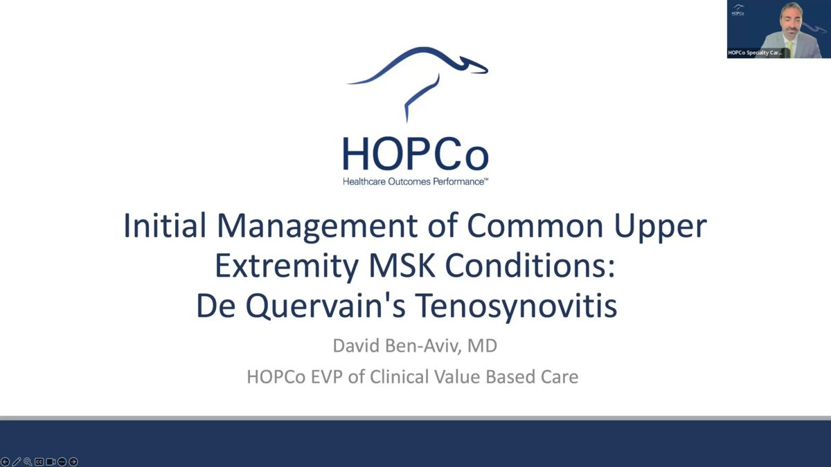 Thank you for joining our CM presentation today. I'm Doctor David Bennett EE VP of Clinical Value Based Care for health care Outcomes Performance Company, also known as Hop O. Our topic for today is the initial management of declare 10 before we get started on the topic uh for today as we do for all CM E events, I want to assure the audience that I have no financial or nonfinancial um uh relationships to disclose as it relates to this topic and subsequent uh discussion as a reminder uh to those of you who have attended other CM topics uh We've presented in the series. Our objective is to improve the continuum of care uh and outcomes for musculoskeletal patients by defining the role of primary care providers in musculoskeletal value based care. We also aim to provide uh diagnostic and management pearls to pcps and other providers referring to M SK specialists. So the providers who manage the initial presentation of many common M SK issues can uh more accurately diagnose and treat these uh conditions. In addition, we aim to help providers identify red flags and other clinical factors. Uh necessitating urgent imaging uh or specialist referrals. At the end of today's sessions, we hope the audience will be able to accurately diagnose vain steno pseudo tis by symptomatology and physical examination, determine which patients with symptoms of deque stenosis novi would be most likely to benefit from therapy and diagnostic imaging and determine which patients should be referred to a specialist for an injection and or surgical management. In order to achieve these objectives, we'll briefly review the HCO specialty Care network tip sheet. Um Then we'll do a brief run through multiple uh important topics in the initial management of this condition starting with a background. Uh then moving to evaluation of the hand and thumb, um and then moving on to tips for conservative treatment testing. And finally, we'll touch on um when a specialist referral may be clinically warranted. HCO and HOP hop specialty Care Network also abbreviated as HS CN. Um believes this information is important to distribute to our referral network um including pcps and all other upstream providers as a way of context. HSC N uh network um comprises more than 230 orthopedic surgeons and musculoskeletal providers across Arizona who have joined forces to follow standardized evidence based clinical pathways. Uh Never before. As a network of uh muscle specialists across the state come together to align around best practice uh delivery and education. And our network is the first of its kind in the country and is already managing and improving outcomes for United Healthcare Medicare advantage patients across Arizona. Uh We anticipated adding additional patient populations uh in the near future. HCO specialty care network is a clinically integrated network which is a type of value based care uh program. Uh by definition, value based care programs incentivize health care providers to provide improved quality of care while reducing unnecessary cost. Uh Of note, HSEN was recently recognized by a top national accreditation organization um uh for its commitment to clinical integration and high quality care. HSEN is actually the first specialty network in the country to be awarded accreditation uh as a high quality clinically uh integrated network. Uh HSEN also collaborates with other providers including yourselves who encounter uh M SK conditions with the goal of improving uh patient outcomes and experience. And as all of you are well aware, a lot of the initial management of MSK conditions occurs not at the specialist level but upstream including in the PCP clinic. Uh in saying this, it's clear that a population health program uh clearly relies on pcps to help reduce unnecessary M SK costs as uh PCPs are the most common gatekeeper uh for M SK care. Before we dive into the topic of the day, it's important to mention that this information shared in this talk is evidence based and consensus driven uh with a recommended practice designed to be implemented for patients with M SK conditions. But um as we said in uh other um uh talks in this series. Uh And for any clinical program, clinical discretion should be used uh with these guidelines for patients, especially if there's concomitant clinical uh factors or comorbid conditions that may alter the clinically appropriate treatment path. If you've seen other, uh talks in the series, this is uh probably starting to look, um, a little familiar with this tip sheet and we're gonna start with a review of the HSN uh HSEN tip sheet. Um, We sent out this tip sheet to all of you. Um And if you don't have a copy of it, uh please feel free to email us at HSEN at ho dot com. We'd be happy to send you a, a copy of so you could hang this in your clinic as well for reference. Uh The tip cheat is more specifically older Medicare uh advantage uh and Medicare uh population, but the tips here are relevant to a younger population as well. Um Today, we're gonna focus on thumb and hand pain due to larva and stenos innovates. This is the fourth line on this tip sheet uh with recommendations um for initial management um for these categories similar to that of carpal tunnel syndrome, uh we will go through each column in more detail, but it's a good way to, to see the overall suggestions of the specialist for initial management. Um As you can see from the tip sheet for deque vein related uh pain. Um initial management uh comprises of conservative care which may include activity modification and possible uh DM E uh prescriptions but does not include therapy or advanced imaging. Uh As you can see here, uh notated by a red icons, Quean steno sotis, um also known as Quean steno vaginitis, is uh named after Swiss surgeon, uh Fritz Deer vein. Uh as a review deque steno sotis, uh is inflammation of the first extensor compartment of the wrist located proximal to the thumb. I may be taking a little bit back to anatomy class. Here. Th