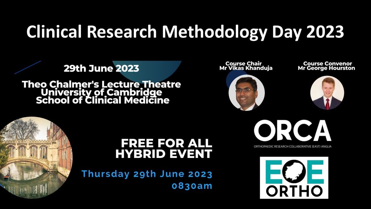 Welcome to the 4th annual Clinical Research Methodology Day hosted by the Orthopaedic Research Collaborative East Anglia (ORCA)! On June 29th, 2023, explore how to answer fundamental research questions utilizing the best research methodology through insight from a diverse faculty of experts from the University of Cambridge, OrthoEvidence, McMaster University, and the Nuffield Department of Orthopaedics Rheumatology and Musculoskeletal Science (NDORMS). You will receive a certificate for attending and gain skills which meet the requirements for CCT in the UK and for a broader international curriculum. Learn and network with medical professionals from across the region online or in person at the Thea Chalmers Lecture Theatre at the University of Cambridge. Registration is free, and more information can be found on our social media platforms, website, and email.