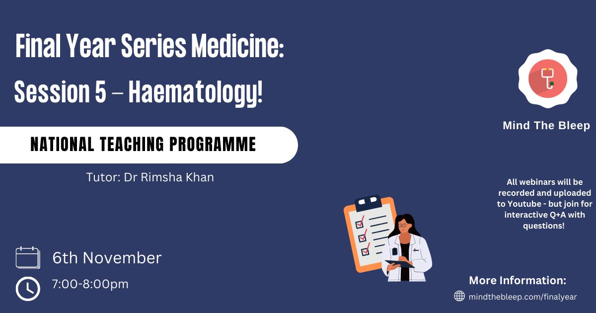 The 5th session of a 4 month Mind the Bleep Final Year Series! Dr Rimsha Khan (FY1 currently on haemato-oncology) will talk you through a summary of Haematology for finals! A topic often feared, we hope to break this down & highlight the most important things to be aware of! Come along to refresh yourself on the following topics: