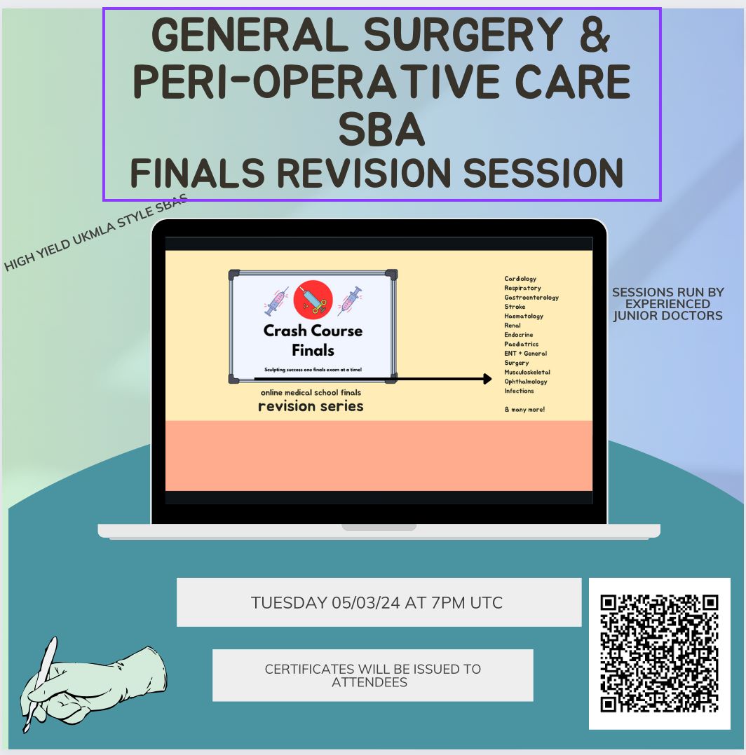 Join our General Surgery & Peri-Operative Care SBA session designed specifically for medical finals, conducted by Dr. Ankit Gupta (FY2), who brings his practical surgical experience to the teaching session. Engage in high yield MLA finals styles questions, with levels of difficulty increasing with each round. Benefit from crucial clinical insights provided by instructors who have themselves worked in the specialty they teach. This session will not only test your knowledge, but also offer you a real-world perspective of general surgery & peri-operative care, making it highly relevant and beneficial for your medical finals studying.