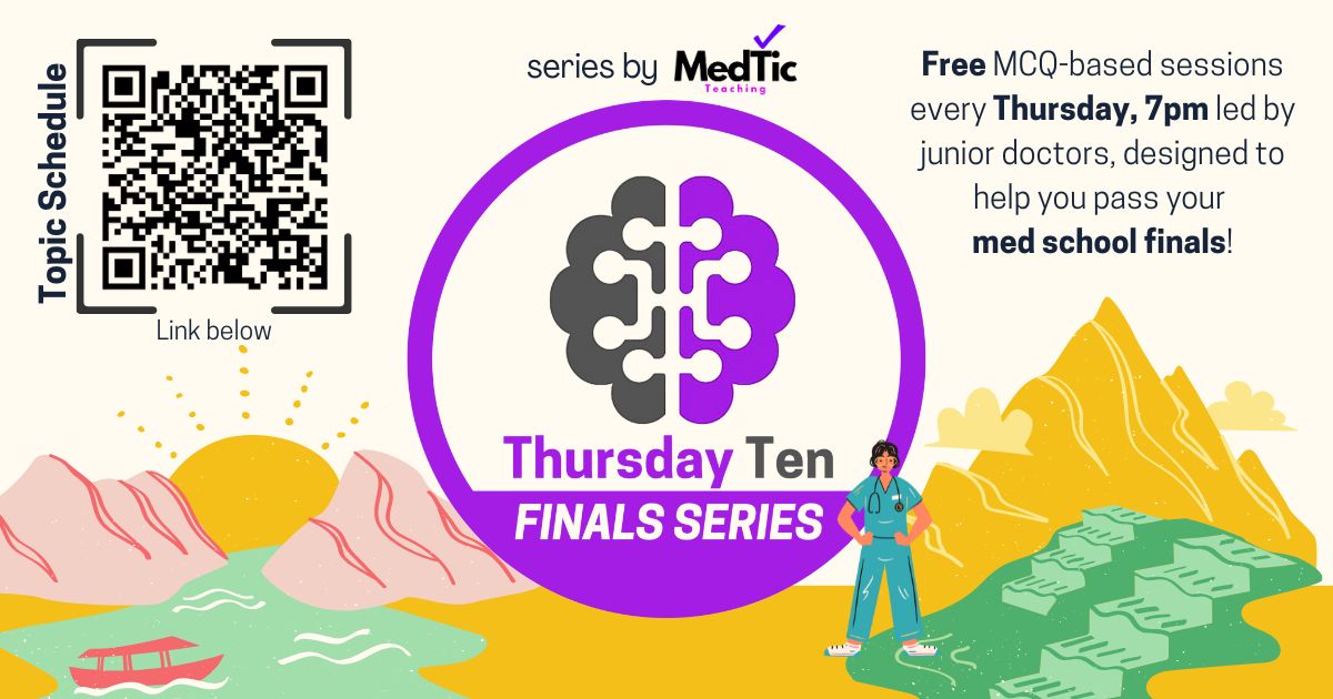 Join us for our "Road to Finals” series, delivered by MedTic teaching, where we will cover 10 MCQs over 1 hour. The content is aligned with the UKMLA curriculum. Sign up for our session every Thursday at 7pm.